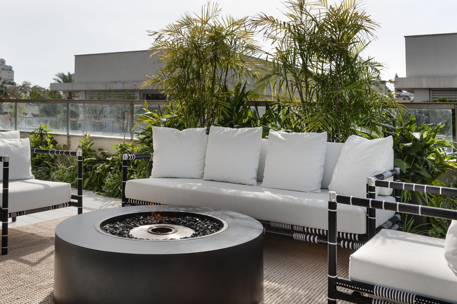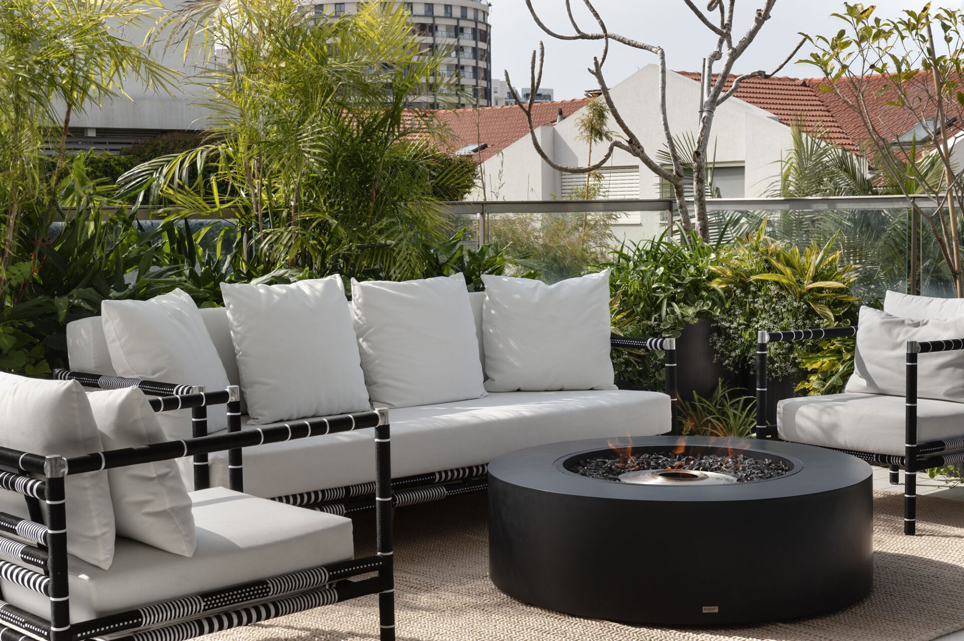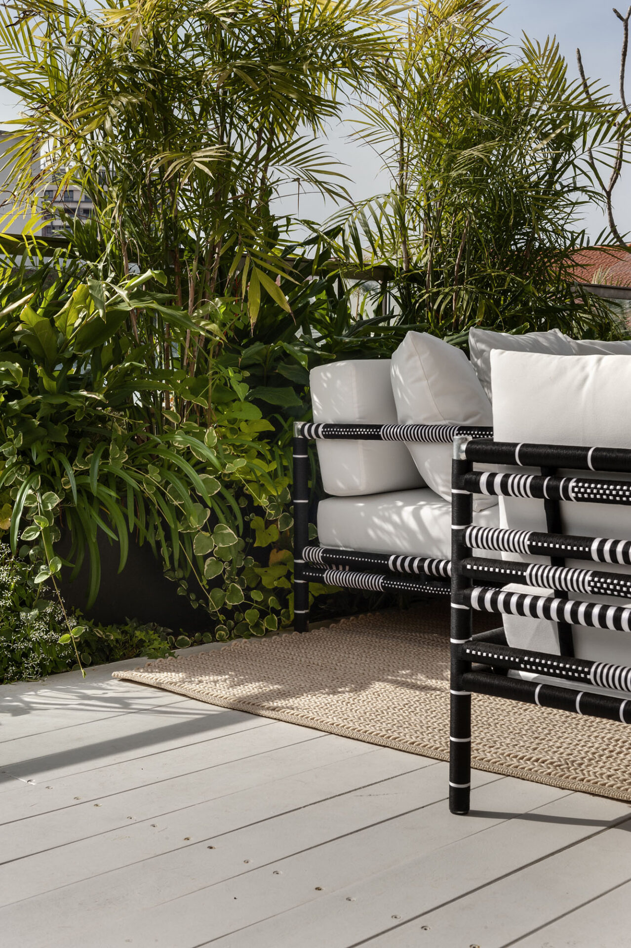 The terrace was designed as a direct and natural extension of the living room, creating a generous outdoor hosting area – nearly twice the size of the interior space. The use of lush tropical planting forms a rich green envelope that evokes the atmosphere of a Thai resort, offering a sense of escape, calm, and vacation in the heart of the city.
