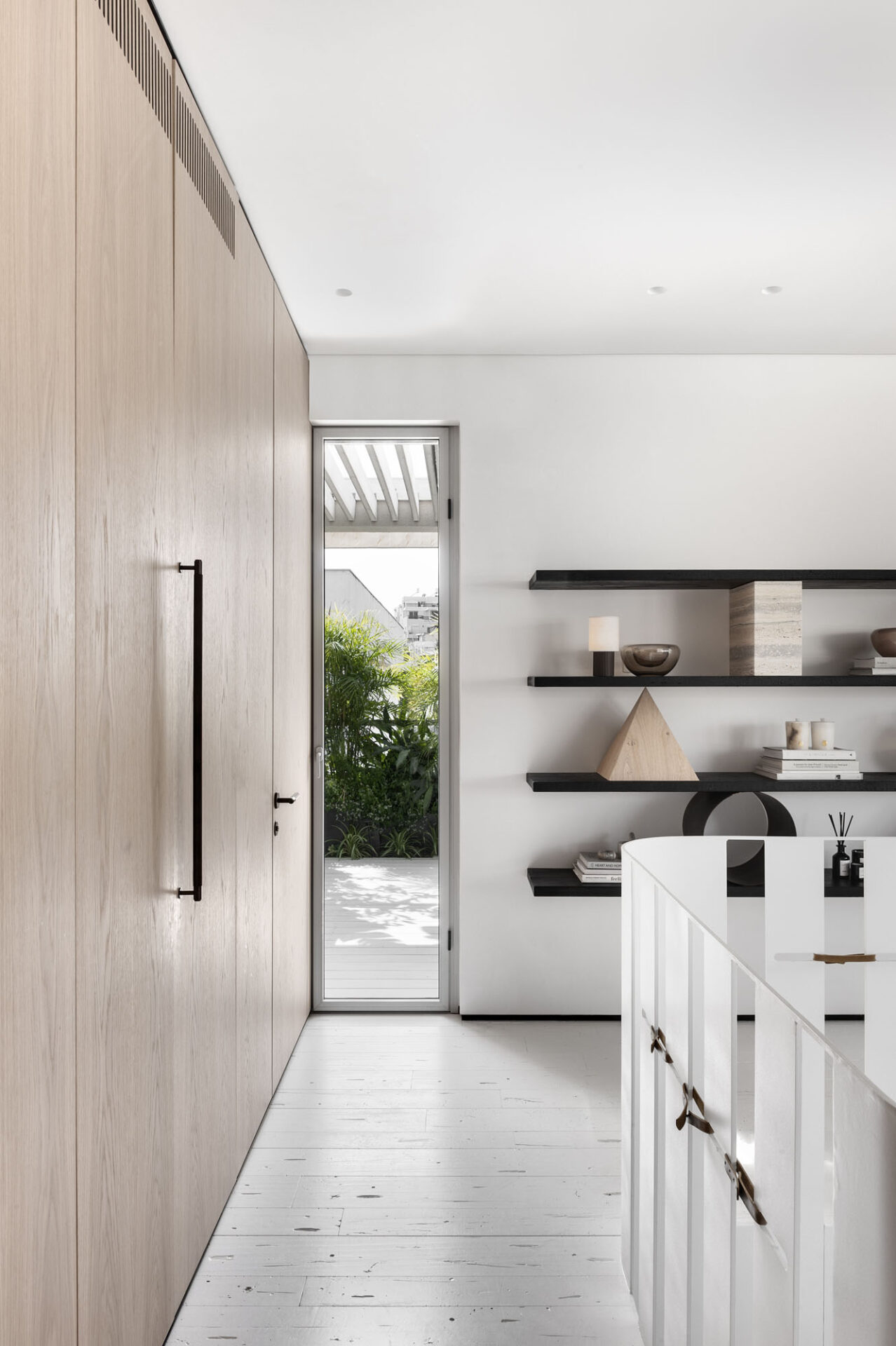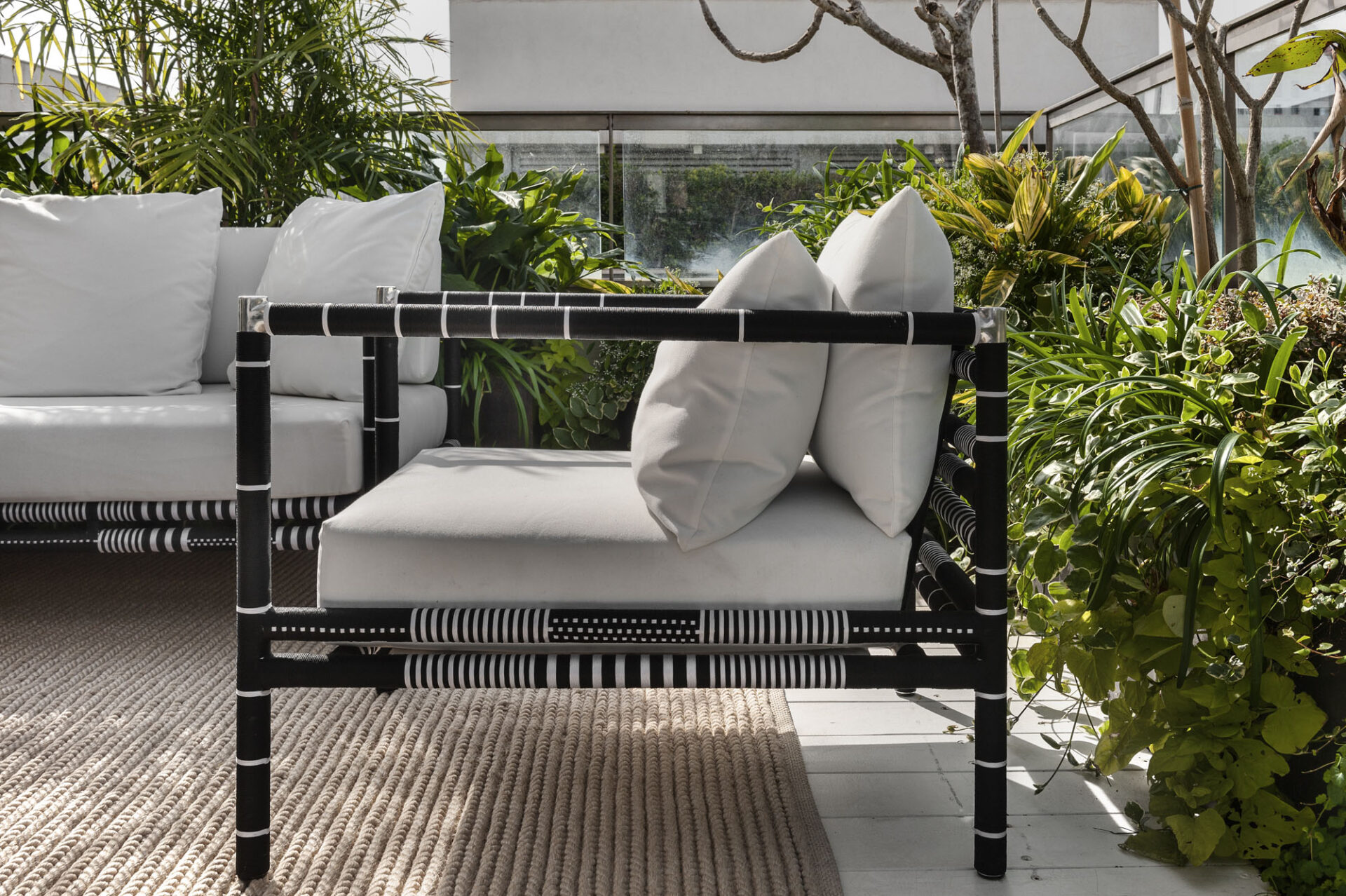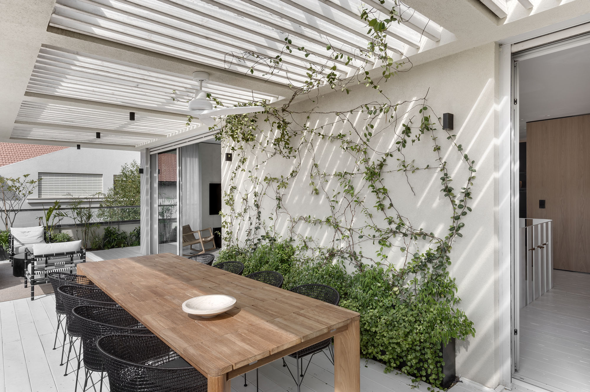 The terrace was designed as a direct and natural extension of the living room, creating a generous outdoor hosting area – nearly twice the size of the interior space. The use of lush tropical planting forms a rich green envelope that evokes the atmosphere of a Thai resort, offering a sense of escape, calm, and vacation in the heart of the city.