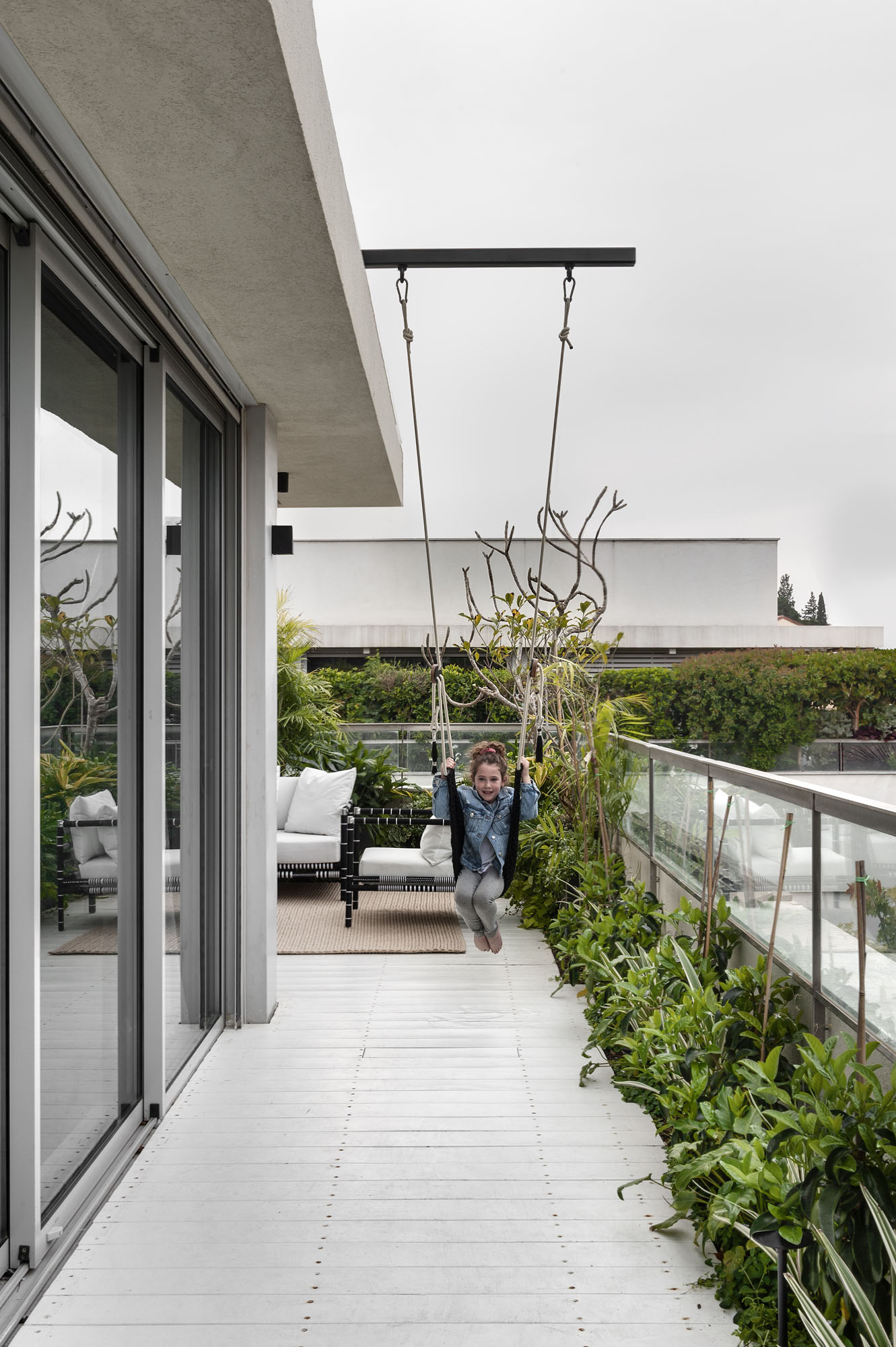 The existing deck floor was renewed and painted in a clean white tone, enhancing the presence of the greenery and giving the space a precise, contemporary character. The variety of seating areas – from a central dining table to relaxed lounges and swings- invites effortless enjoyment of the outdoor space throughout the day.