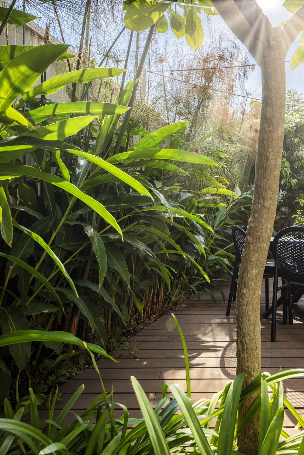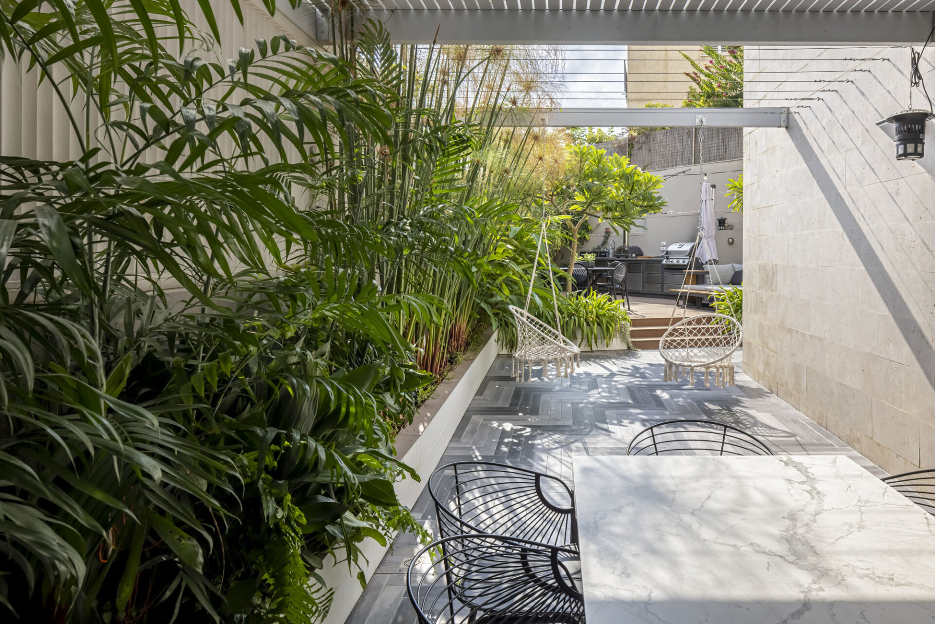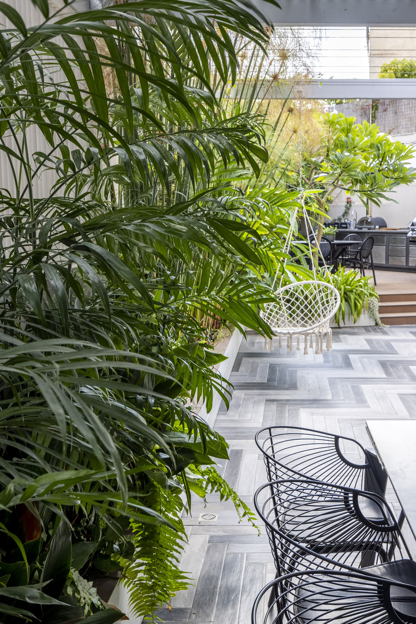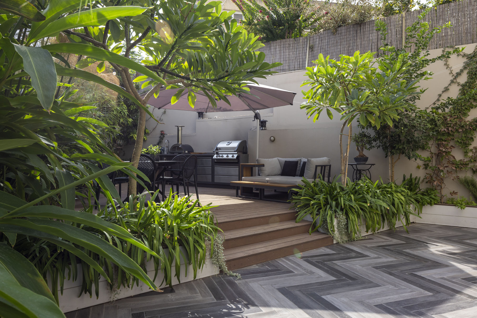 Guided by the clients’ vision of a high-end resort aesthetic, great emphasis was placed on privacy within the urban environment. Custom-designed slat fences were installed, allowing natural light to filter through while effectively shielding the garden from neighbors’ views. The plant palette was carefully selected to maintain this lush “resort” feel with minimal maintenance, perfectly suited to a modern lifestyle. The result is an urban oasis that seamlessly blends smart functionality with uncompromising luxury.