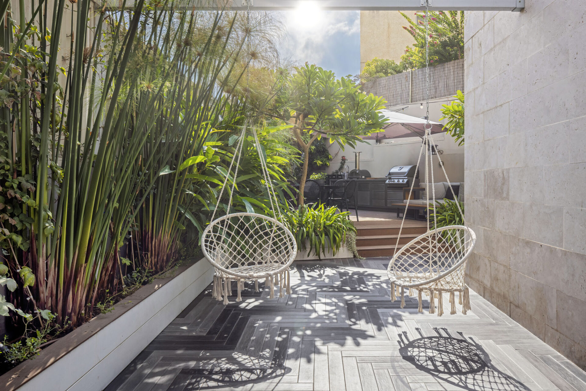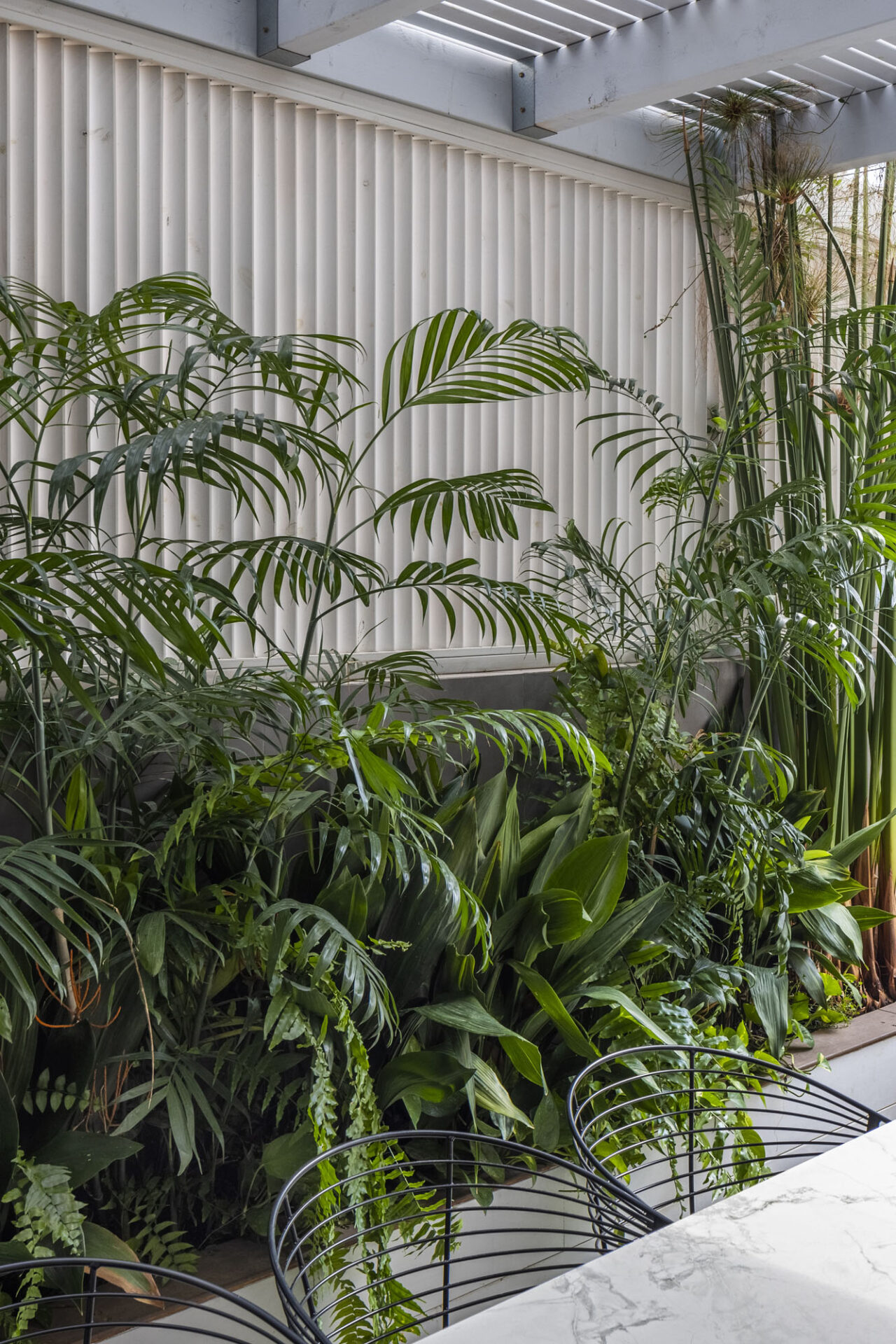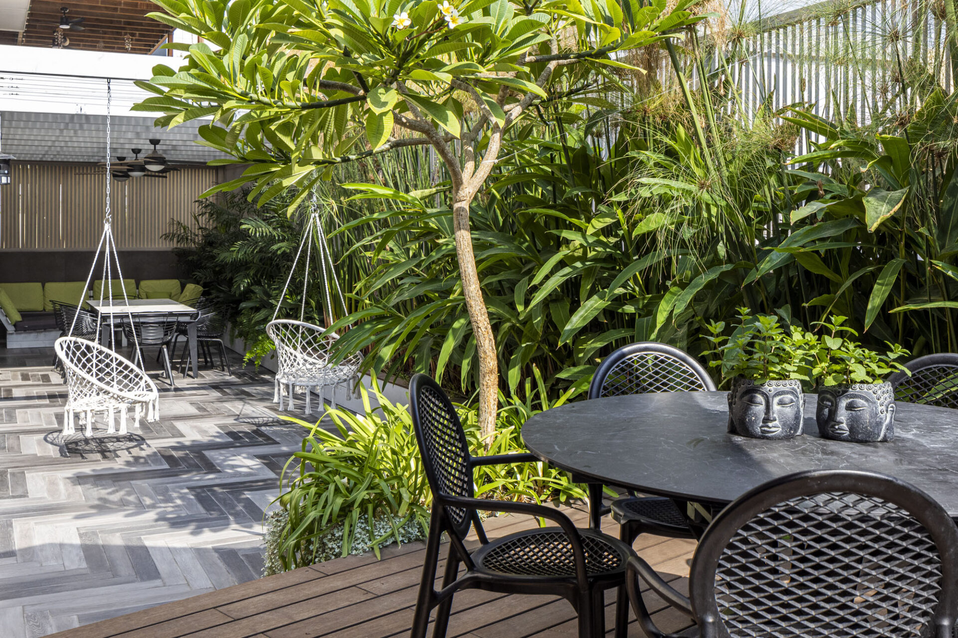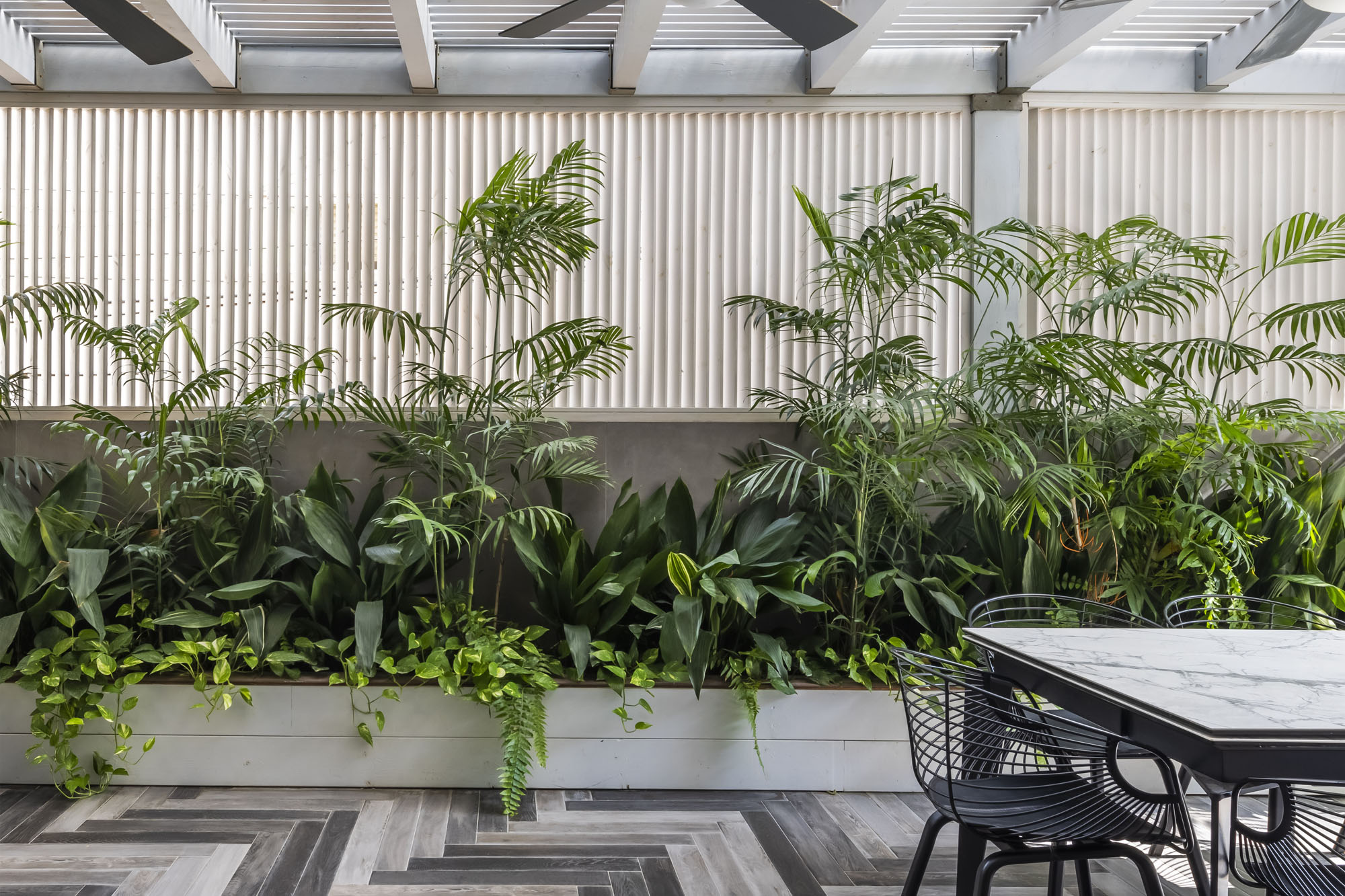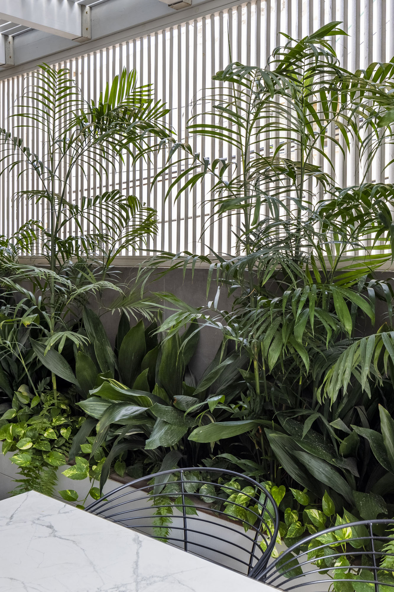 Guided by the clients’ vision of a high-end resort aesthetic, great emphasis was placed on privacy within the urban environment. Custom-designed slat fences were installed, allowing natural light to filter through while effectively shielding the garden from neighbors’ views. The plant palette was carefully selected to maintain this lush “resort” feel with minimal maintenance, perfectly suited to a modern lifestyle. The result is an urban oasis that seamlessly blends smart functionality with uncompromising luxury.