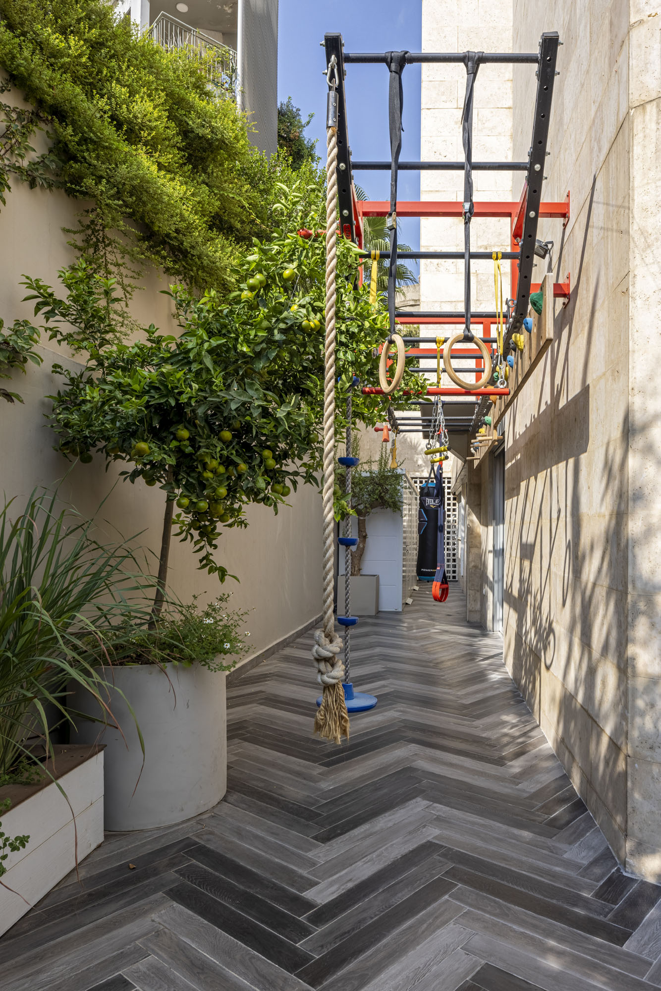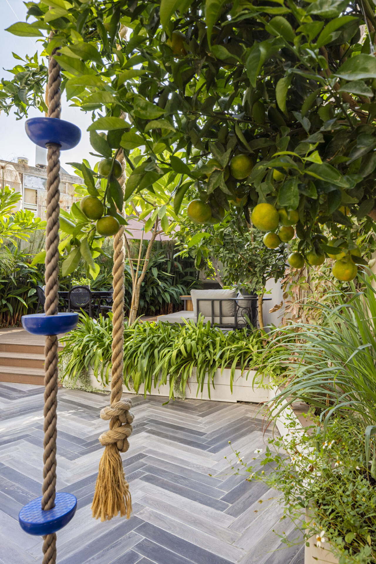 The Givatayim project focused on transforming a challenging outdoor courtyard into a private green sanctuary in the heart of the city. The primary architectural challenge lay in the layout of the terrace- two long, narrow wings meeting at a triangular point – a complex structure that had left the space unused for years. To overcome these spatial constraints, a creative solution was implemented, centered on shifting perspectives and creating visual depth. The main seating area was relocated to the far end of the plot onto a custom elevated platform, establishing a new and inviting focal point.