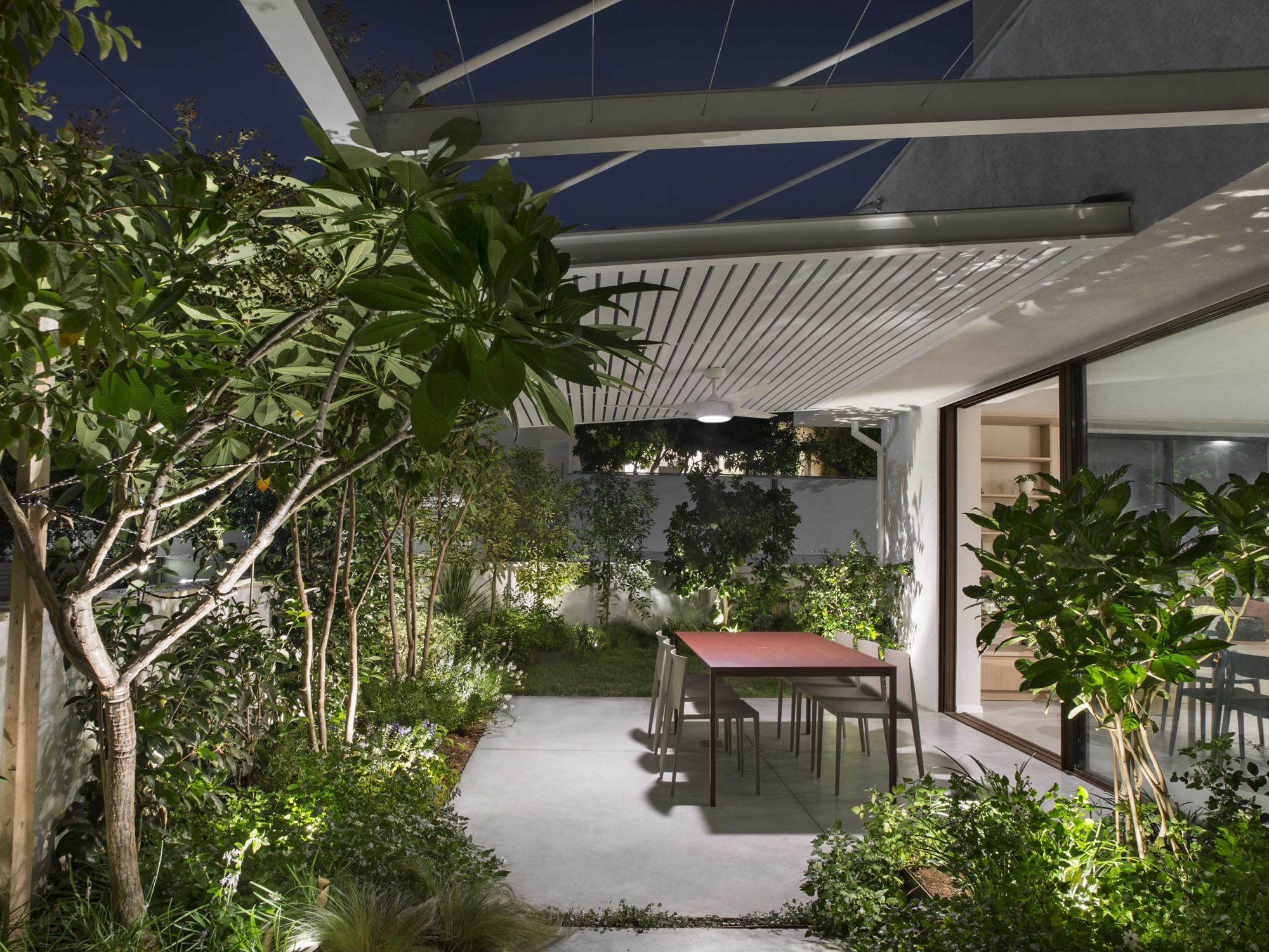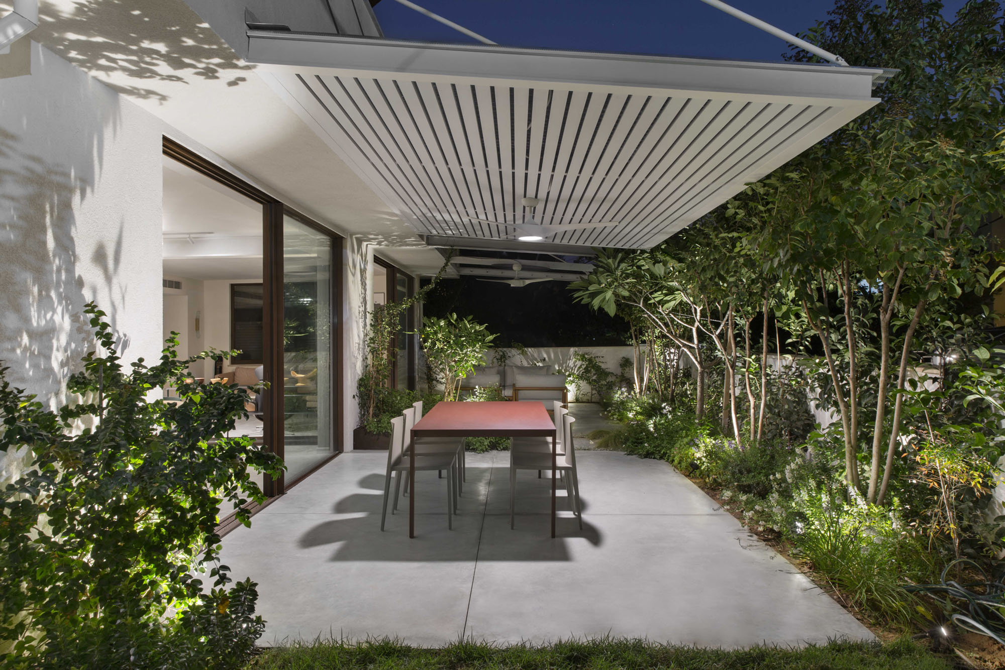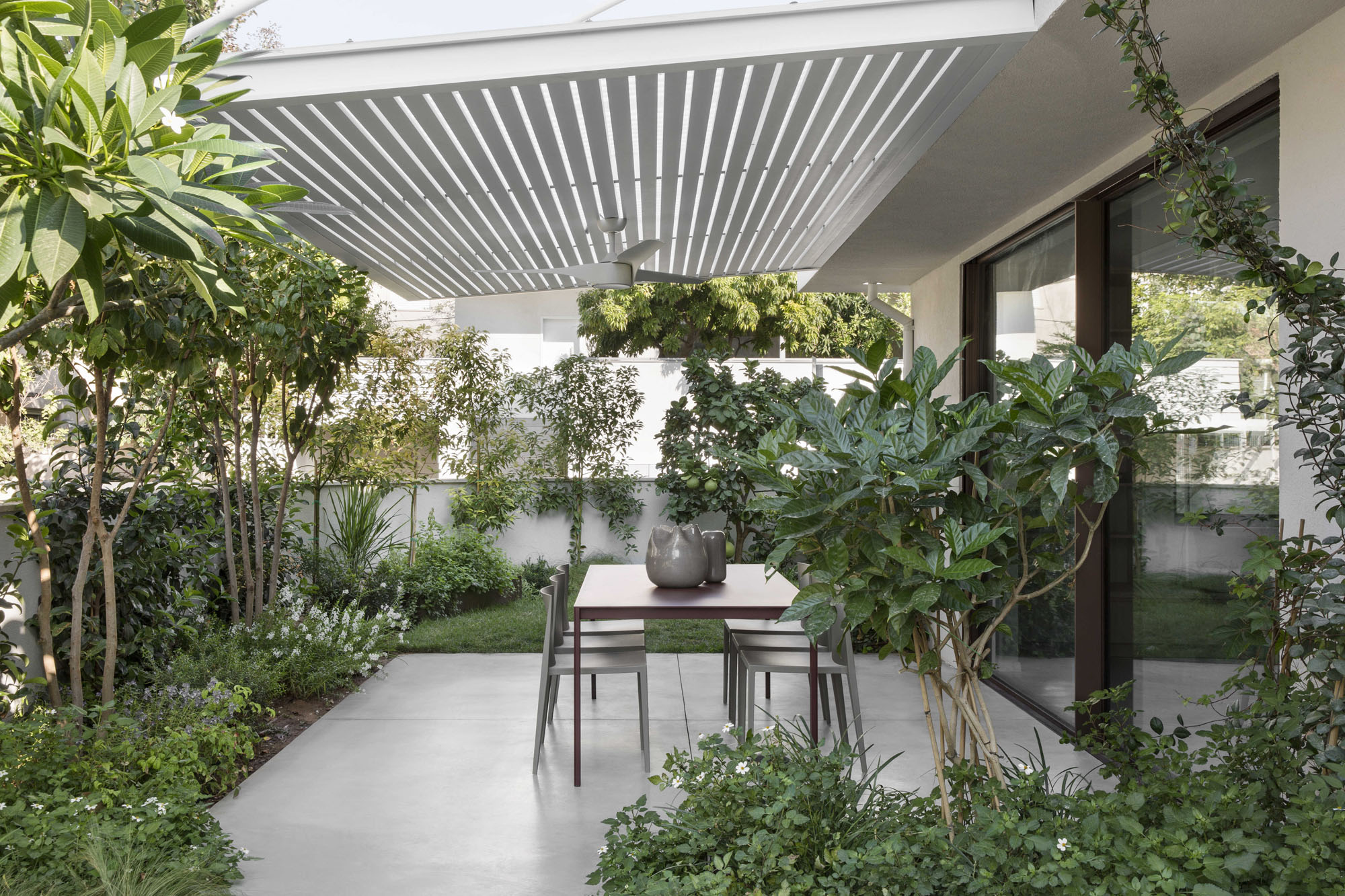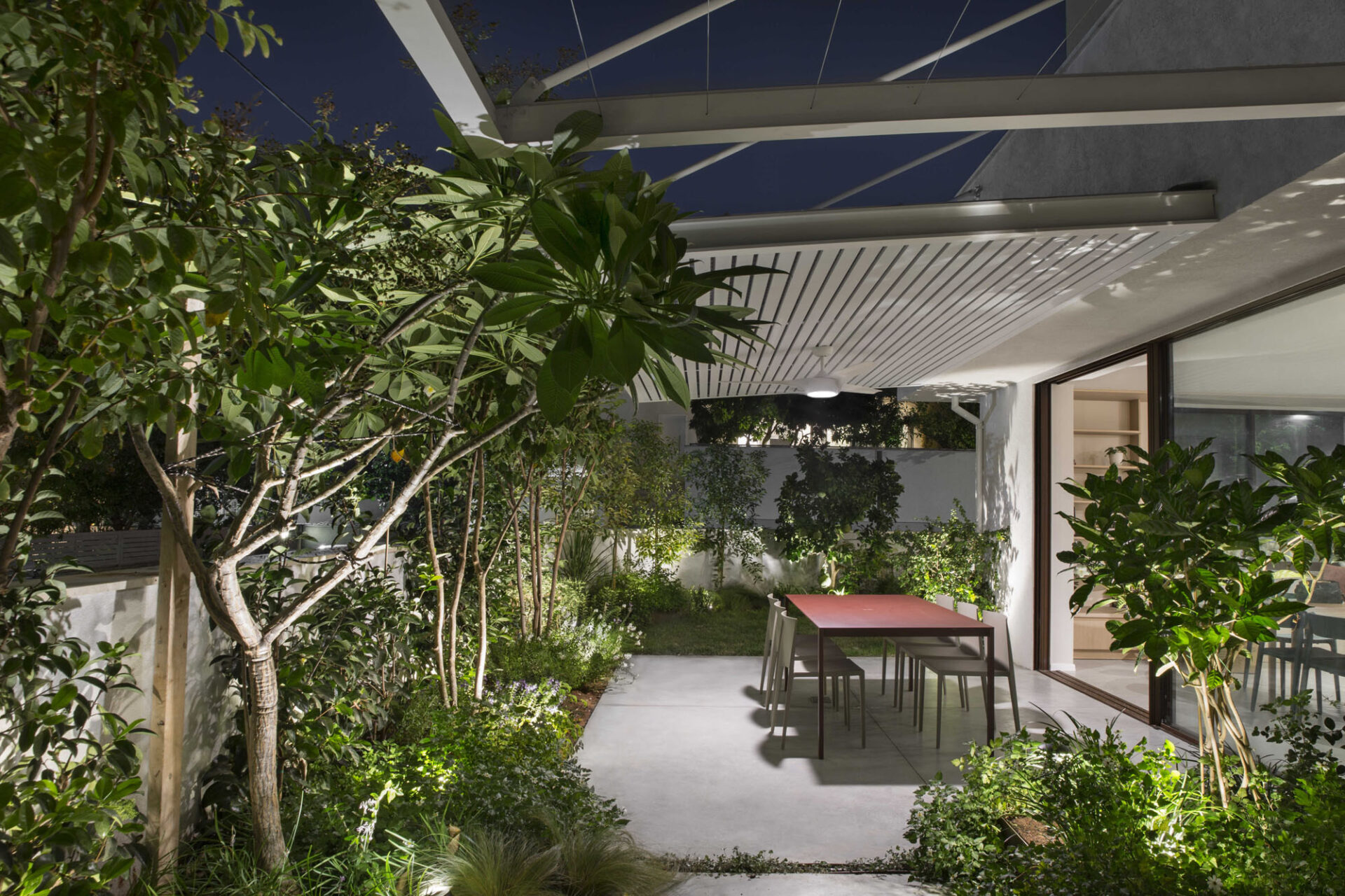 The central area was designed as two complementary hosting zones: a spacious dining area with a generous table beneath a shading pergola, alongside an intimate outdoor lounge protected by a climbing-plant pergola that creates a soft, natural atmosphere. At the heart of the space, we created a “nourishing” garden, including a variety of fruit trees and a dedicated area for growing vegetables, alongside natural shading that enriches the experience of being outdoors. All ground-level surfaces were clad in polished concrete that flows seamlessly from the interior to the exterior and continues into the garden, blurring the boundaries between the home and its surroundings and creating a sense of an open, harmonious, and infinite space.