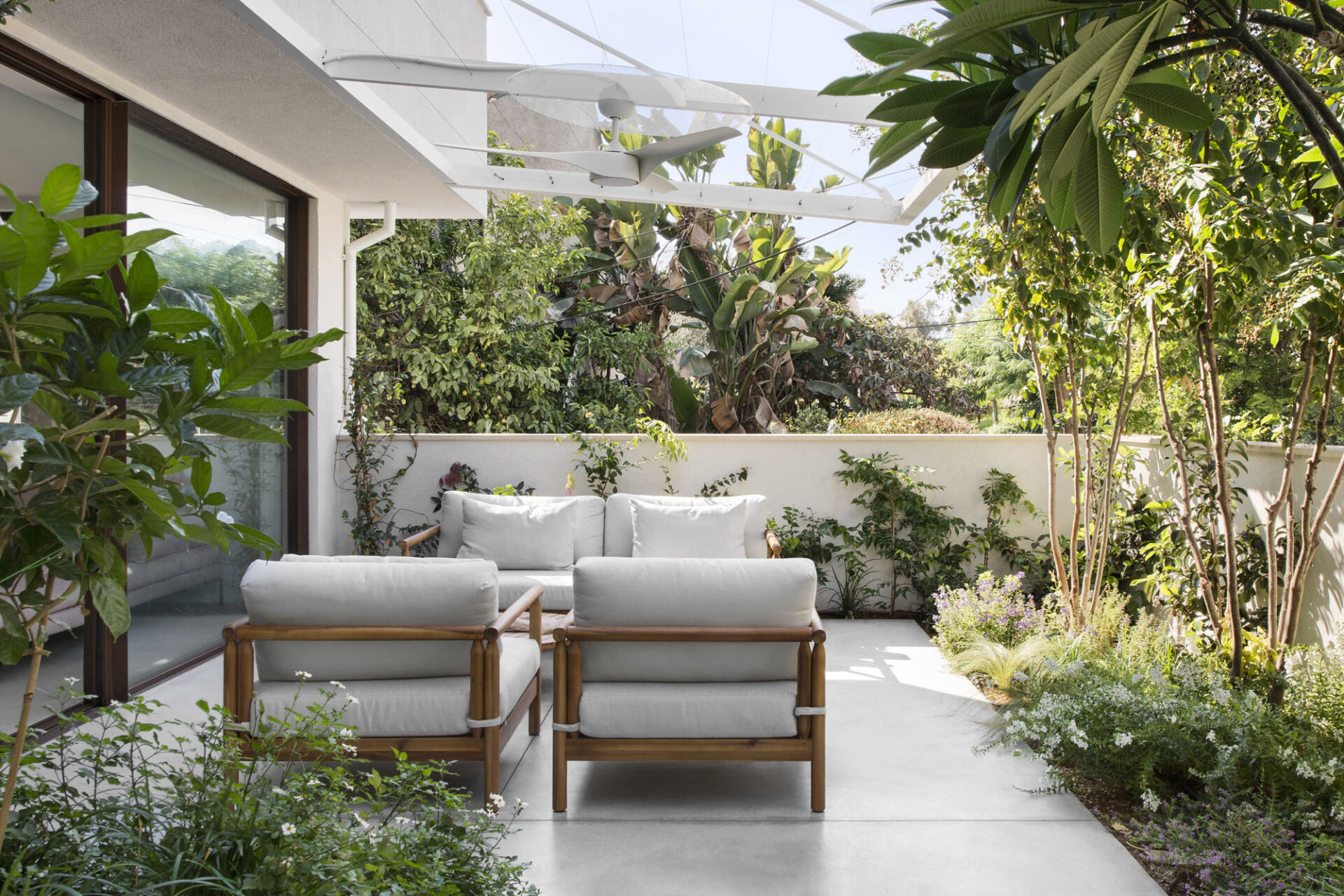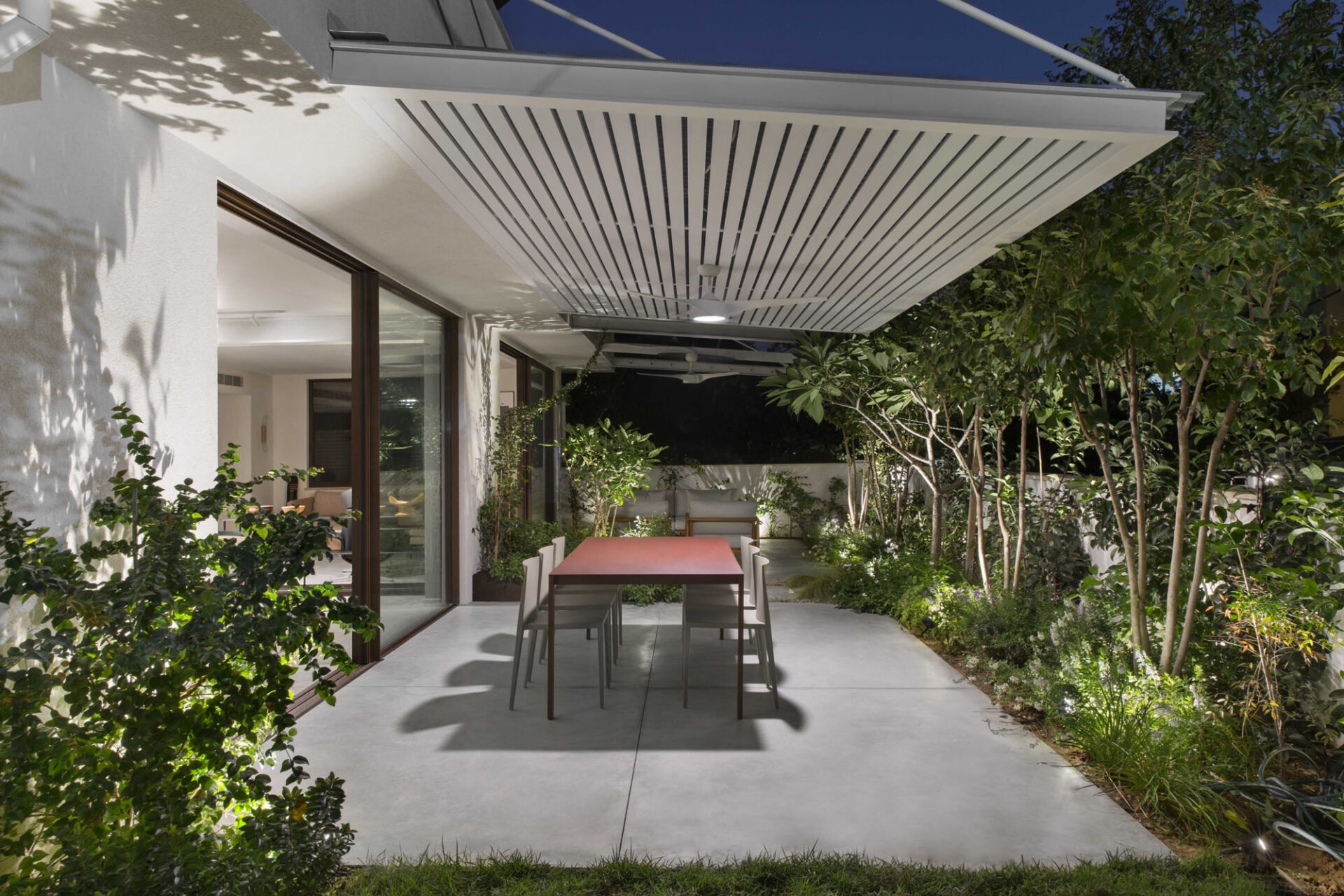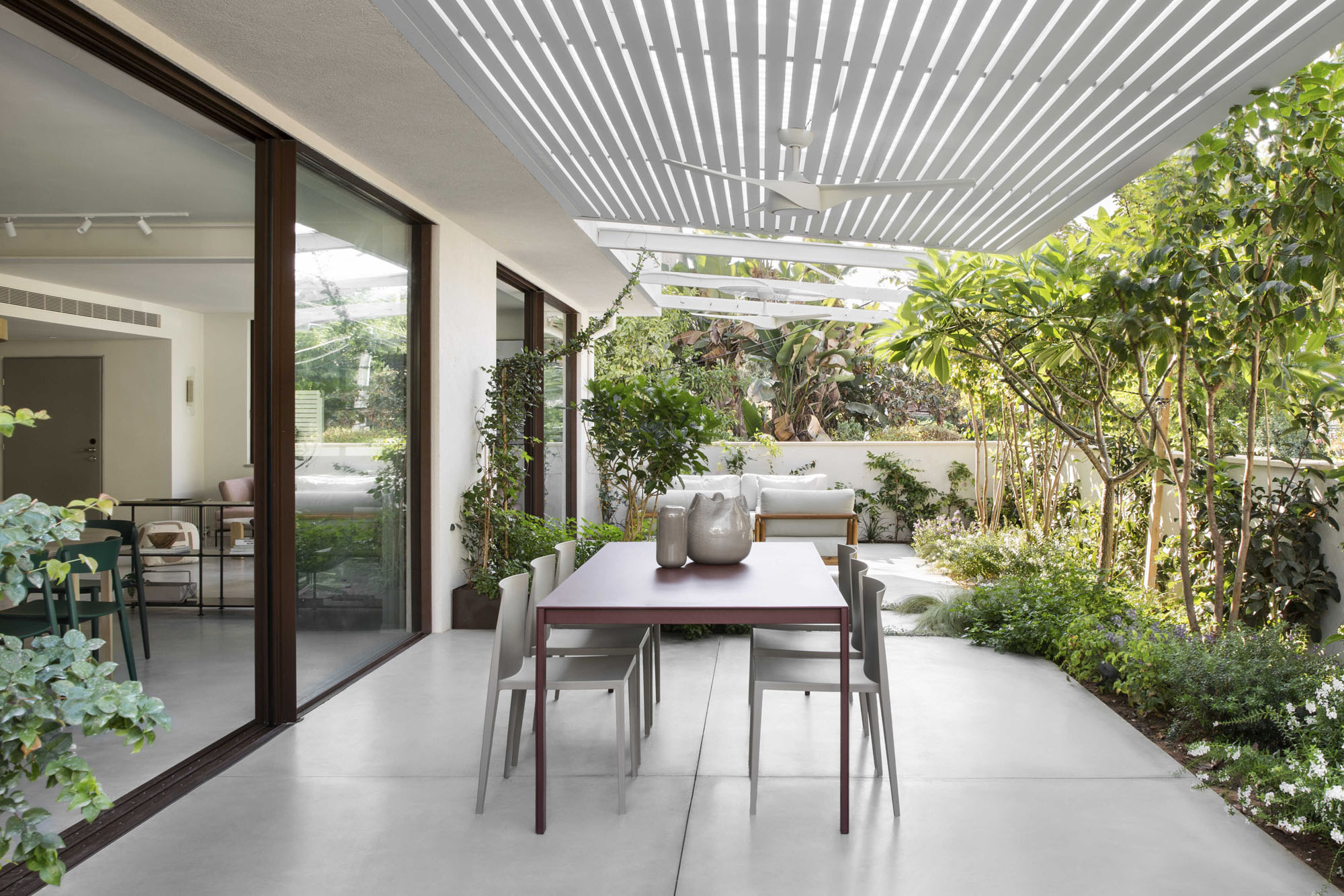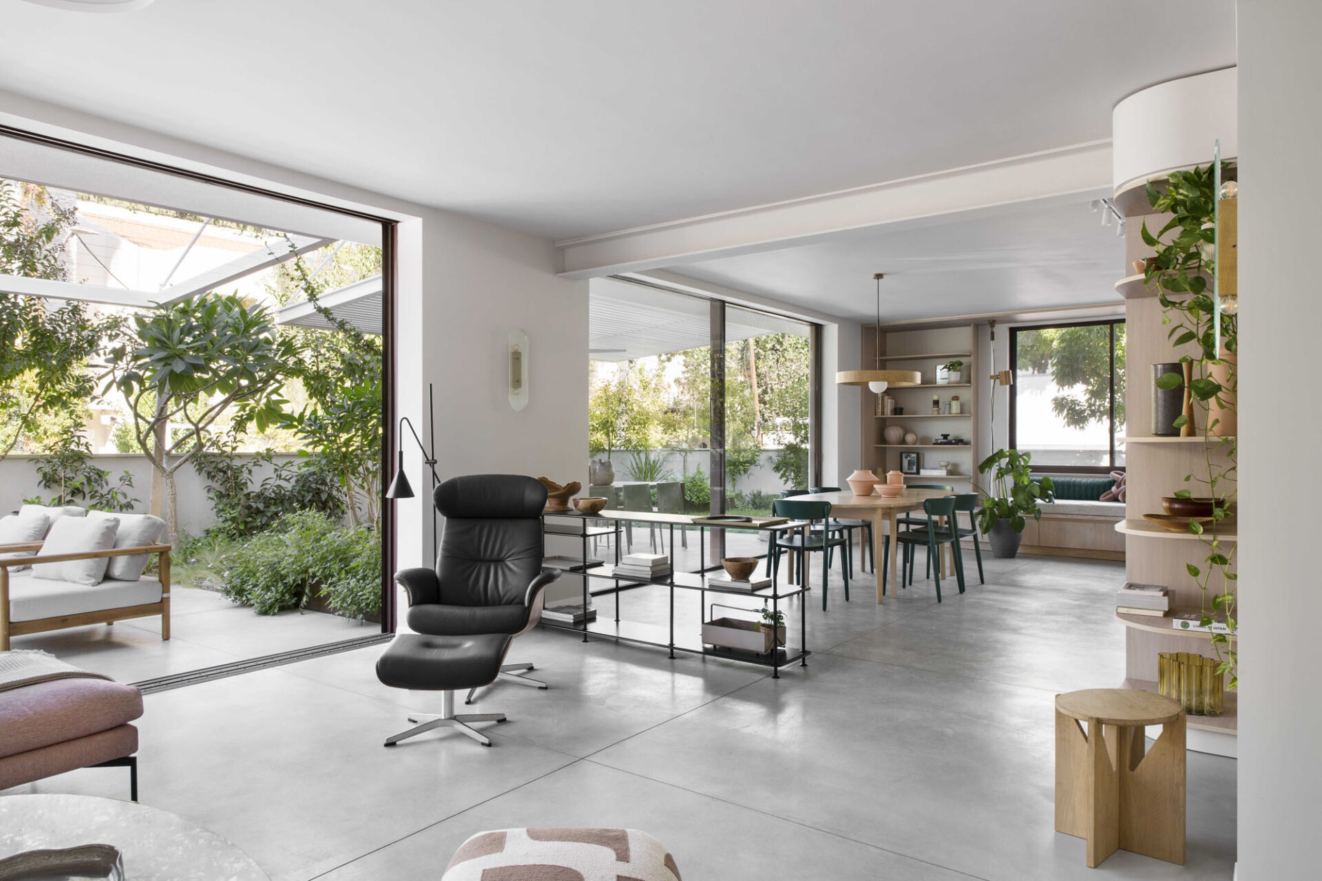 The central area was designed as two complementary hosting zones: a spacious dining area with a generous table beneath a shading pergola, alongside an intimate outdoor lounge protected by a climbing-plant pergola that creates a soft, natural atmosphere. At the heart of the space, we created a “nourishing” garden, including a variety of fruit trees and a dedicated area for growing vegetables, alongside natural shading that enriches the experience of being outdoors. All ground-level surfaces were clad in polished concrete that flows seamlessly from the interior to the exterior and continues into the garden, blurring the boundaries between the home and its surroundings and creating a sense of an open, harmonious, and infinite space.