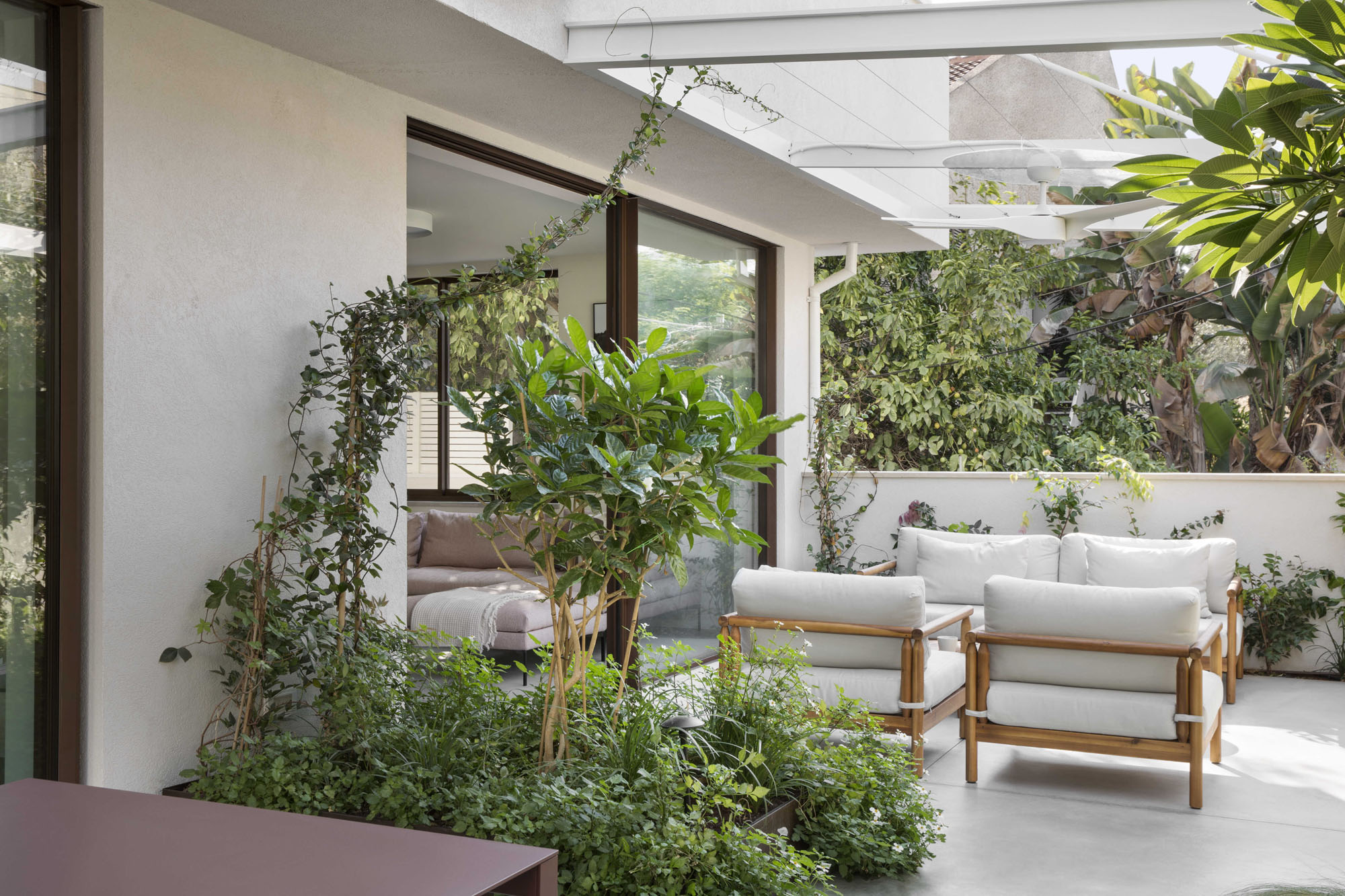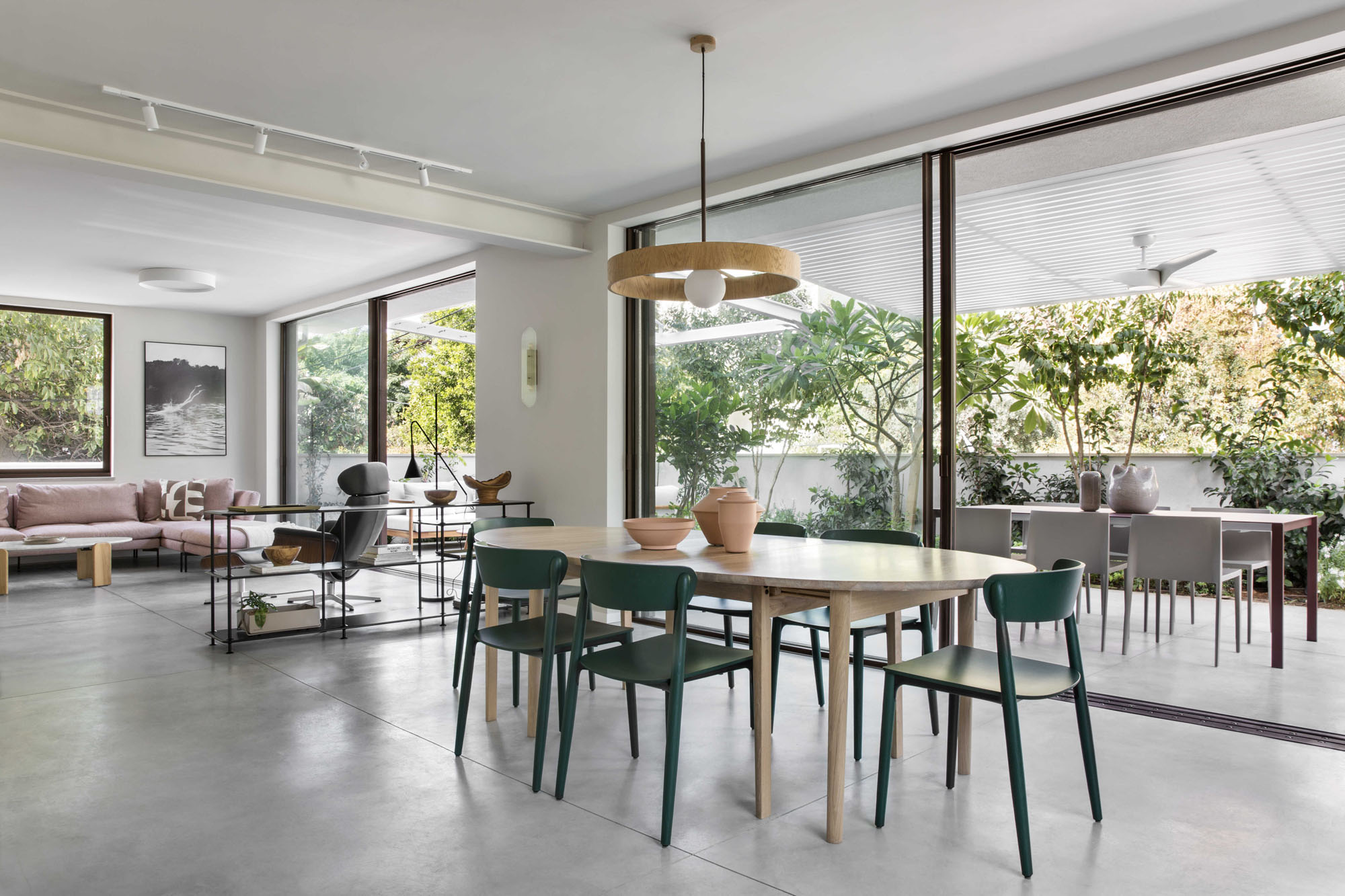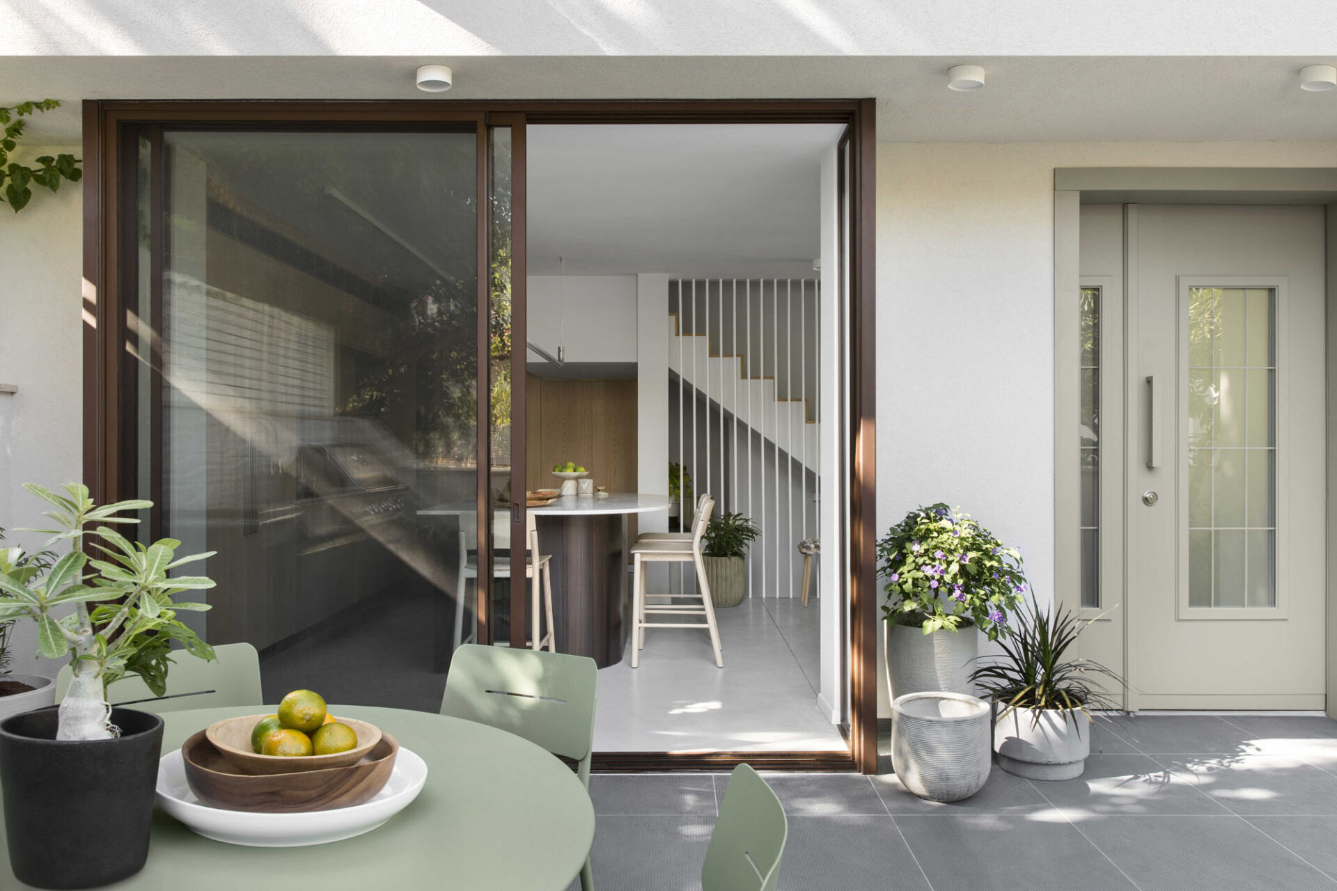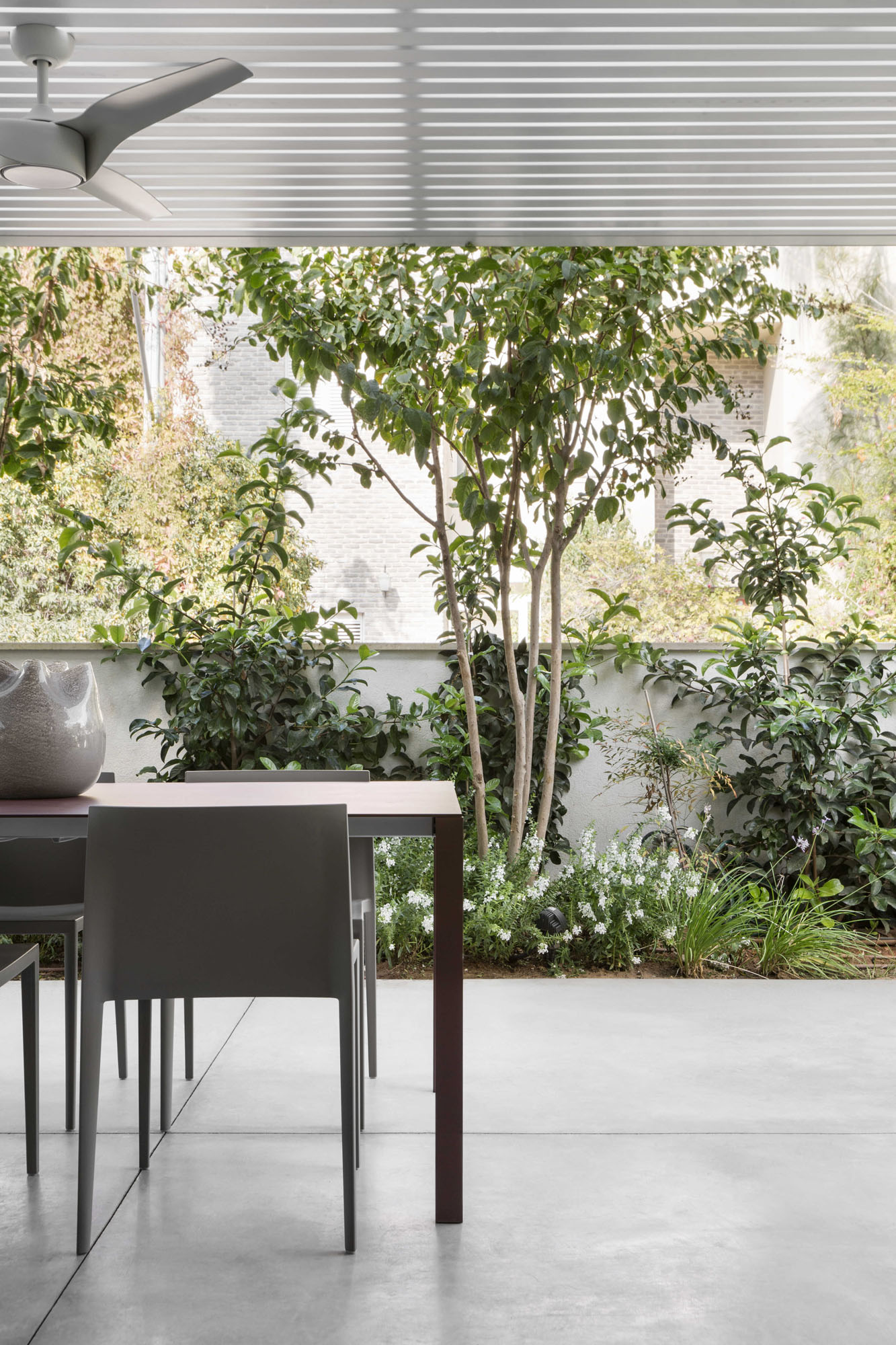 The central area was designed as two complementary hosting zones: a spacious dining area with a generous table beneath a shading pergola, alongside an intimate outdoor lounge protected by a climbing-plant pergola that creates a soft, natural atmosphere. At the heart of the space, we created a “nourishing” garden, including a variety of fruit trees and a dedicated area for growing vegetables, alongside natural shading that enriches the experience of being outdoors. All ground-level surfaces were clad in polished concrete that flows seamlessly from the interior to the exterior and continues into the garden, blurring the boundaries between the home and its surroundings and creating a sense of an open, harmonious, and infinite space.