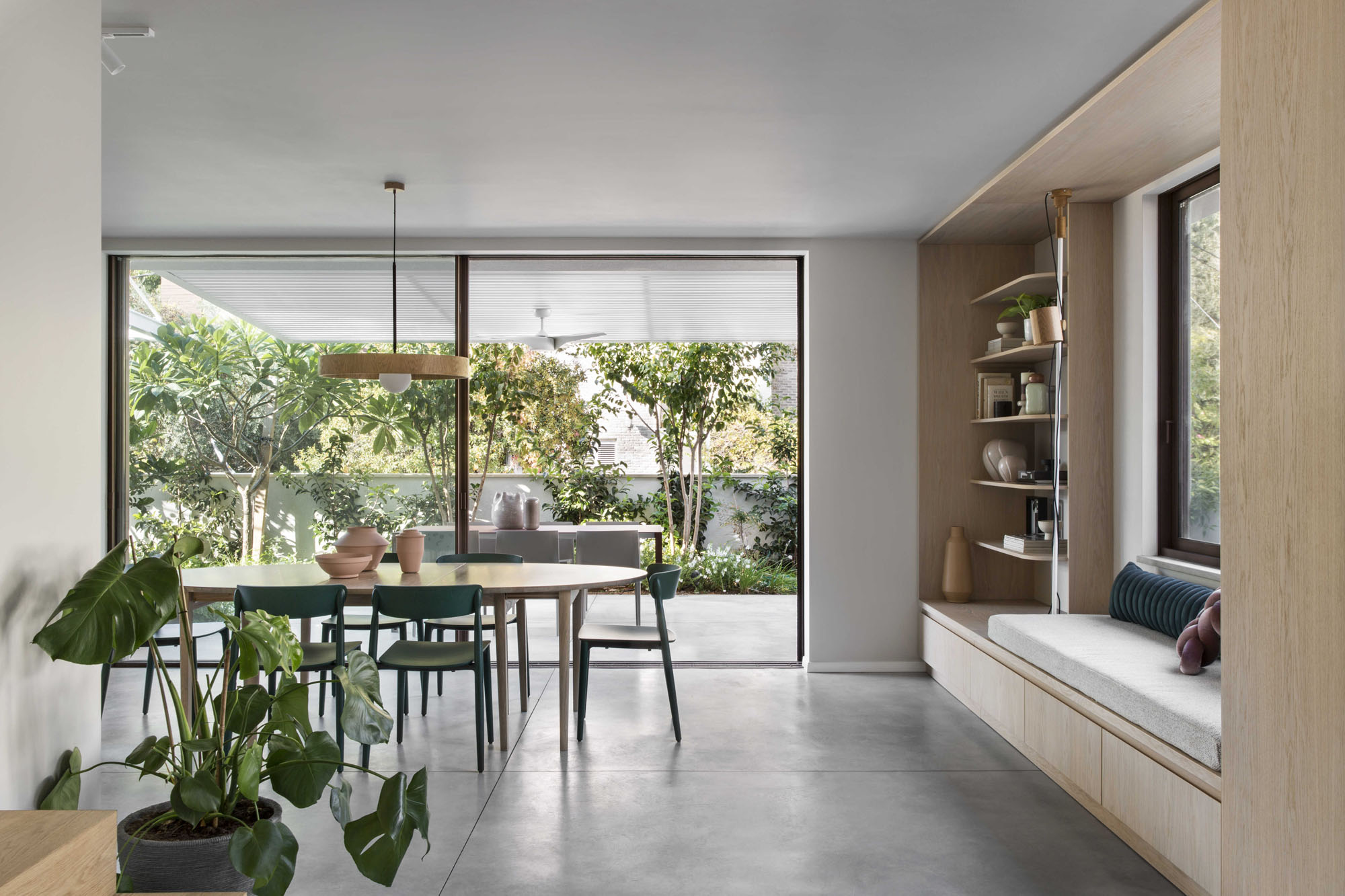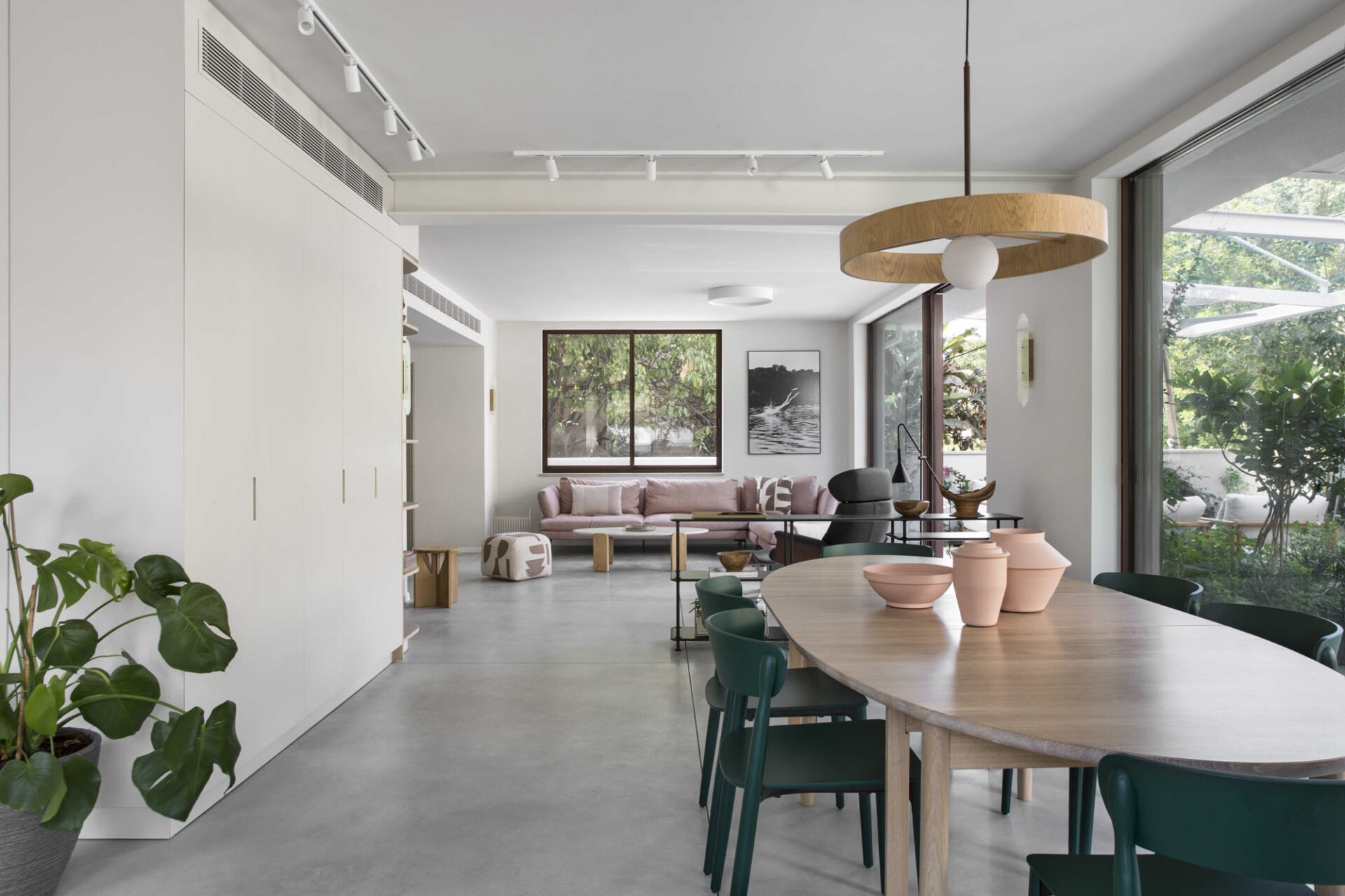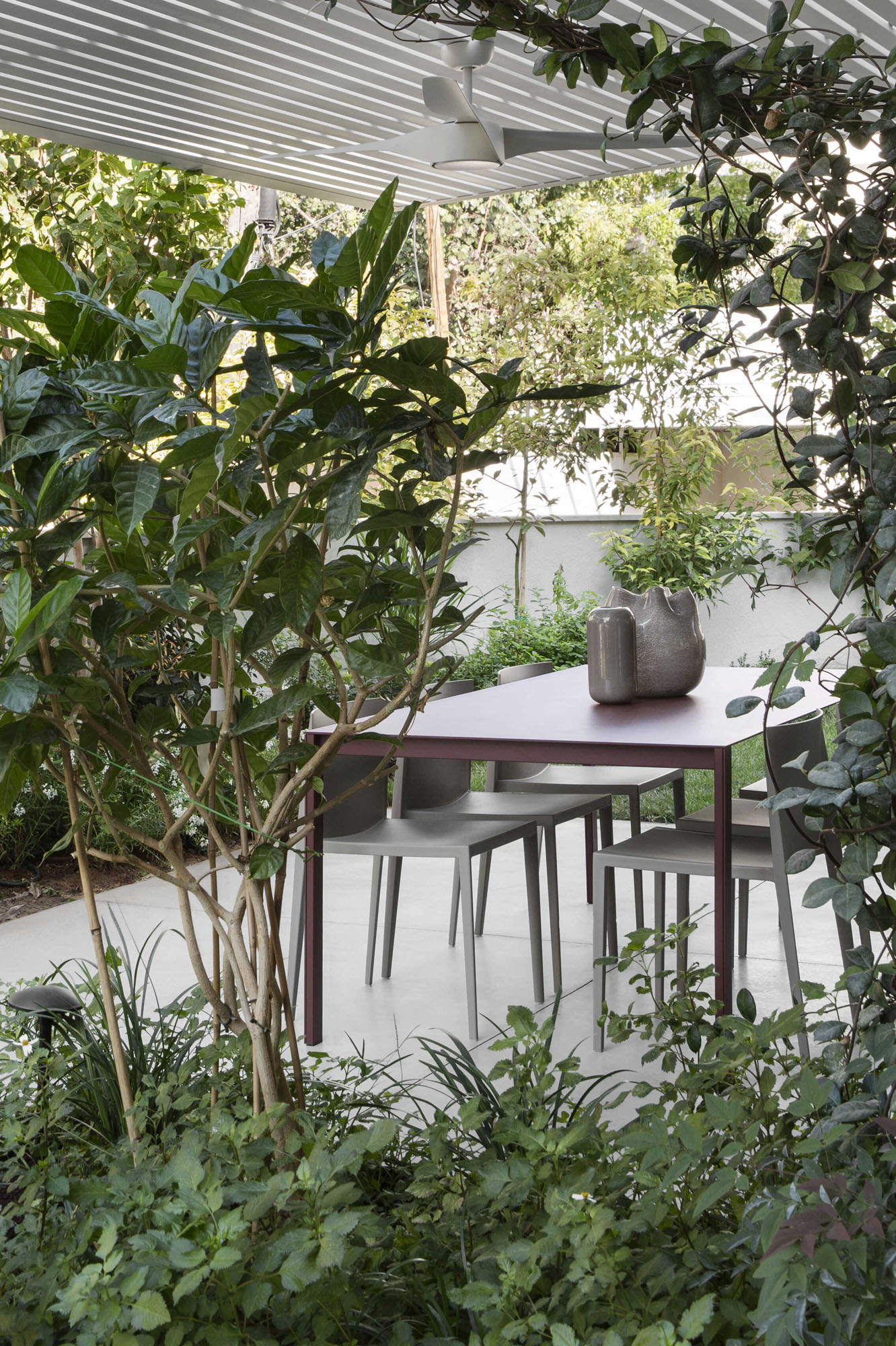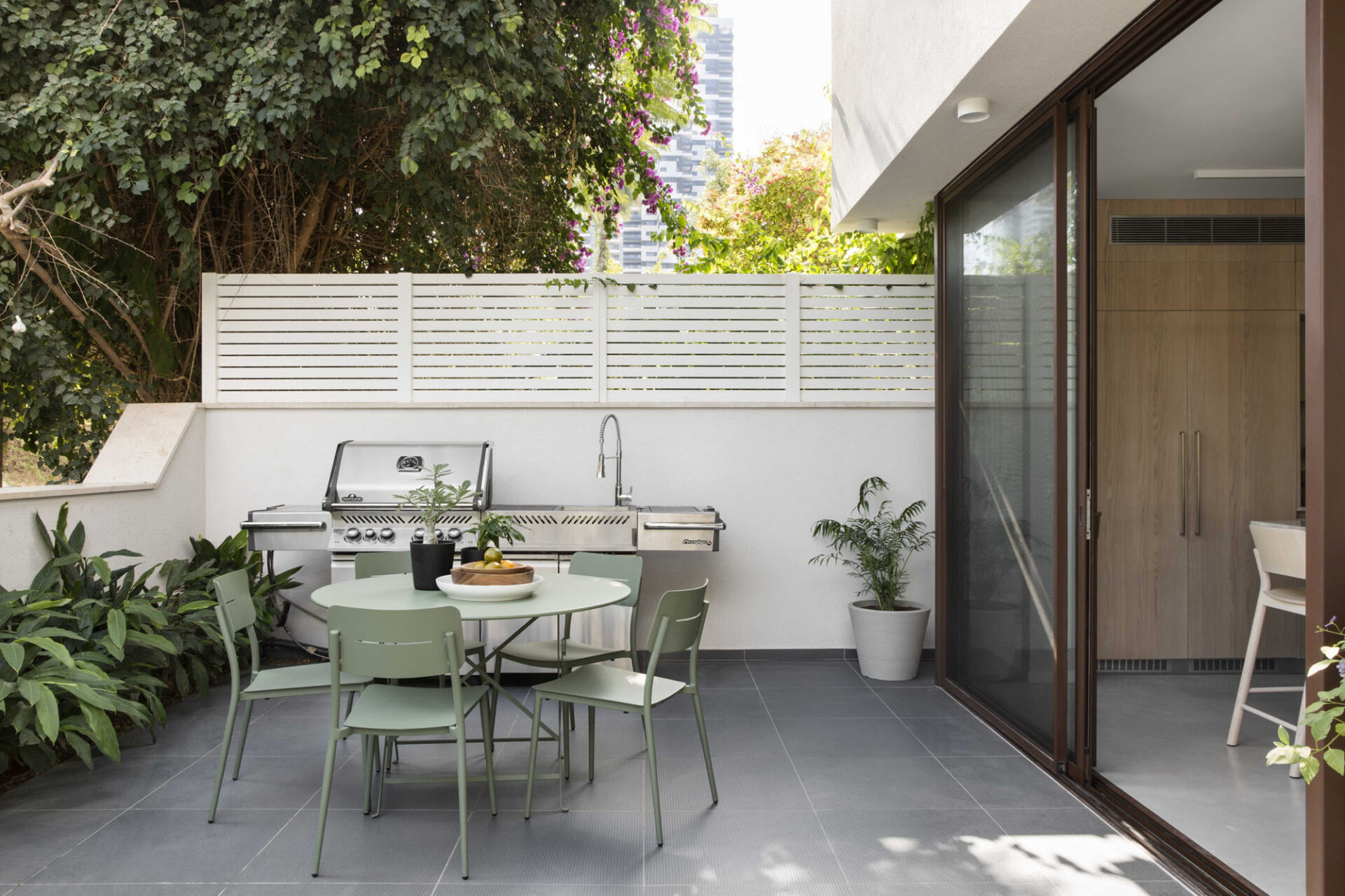 The central area was designed as two complementary hosting zones: a spacious dining area with a generous table beneath a shading pergola, alongside an intimate outdoor lounge protected by a climbing-plant pergola that creates a soft, natural atmosphere. At the heart of the space, we created a “nourishing” garden, including a variety of fruit trees and a dedicated area for growing vegetables, alongside natural shading that enriches the experience of being outdoors. All ground-level surfaces were clad in polished concrete that flows seamlessly from the interior to the exterior and continues into the garden, blurring the boundaries between the home and its surroundings and creating a sense of an open, harmonious, and infinite space.