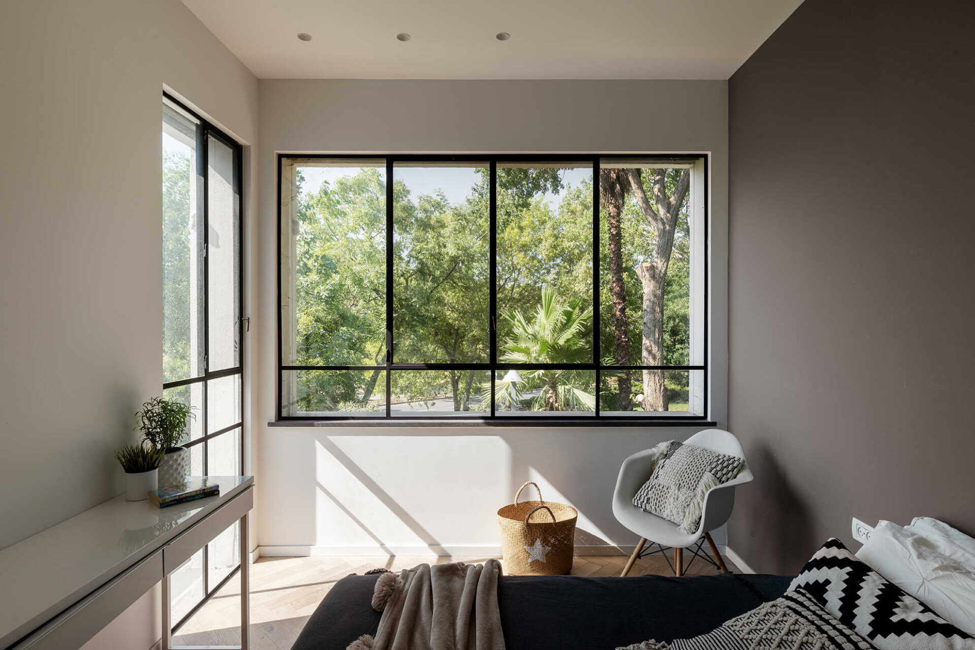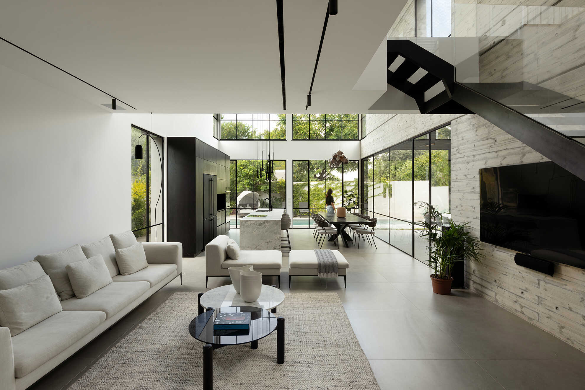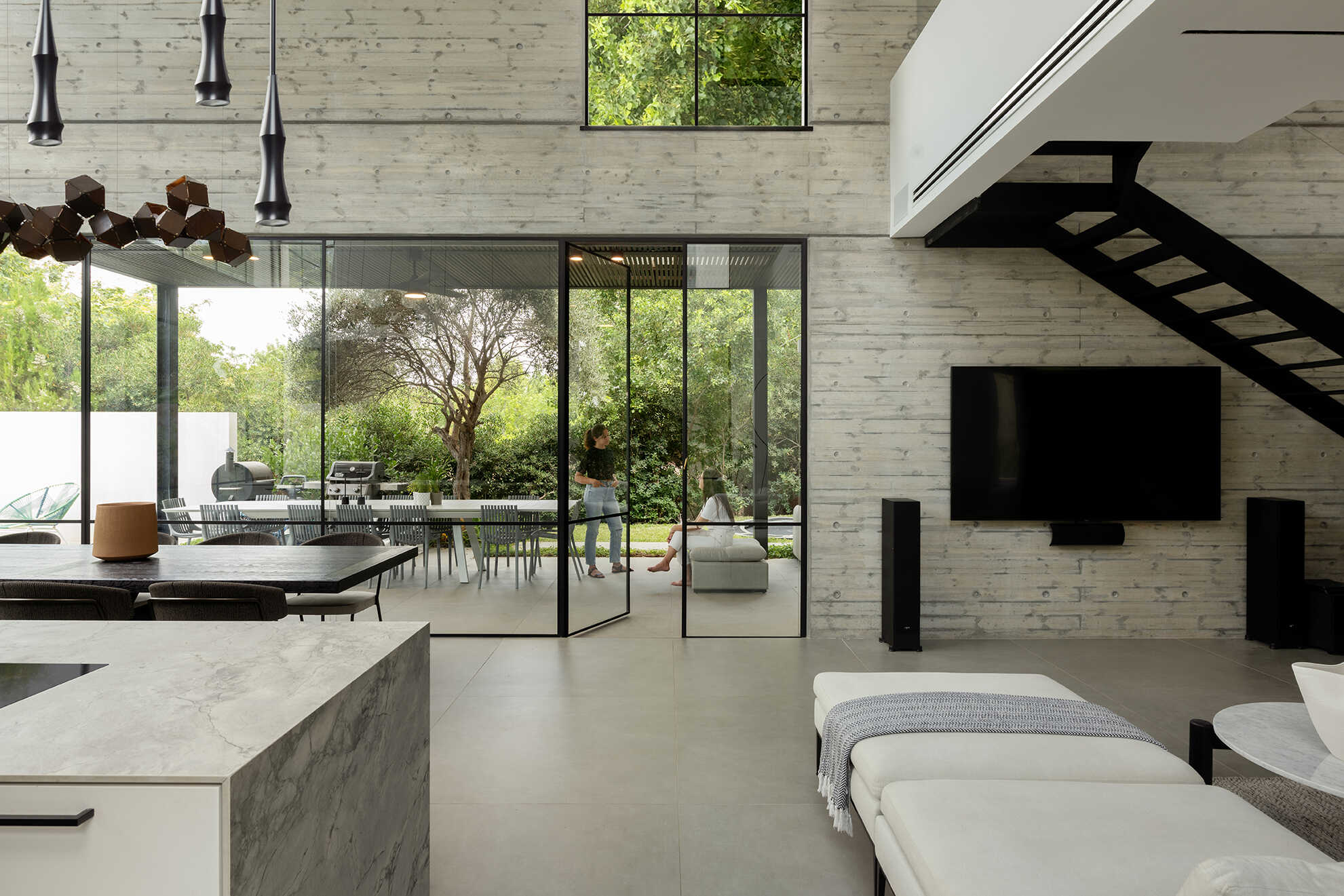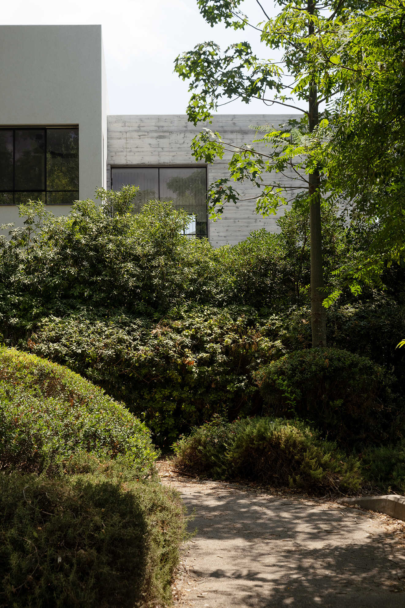 The intense greenery was carefully selected to serve as a complementary contrast to the exposed concrete, thereby enhancing the atmosphere within the home. The planting selection was designed to create a “green screen” that penetrates the living spaces, introducing vitality and softness into the modern environment.
