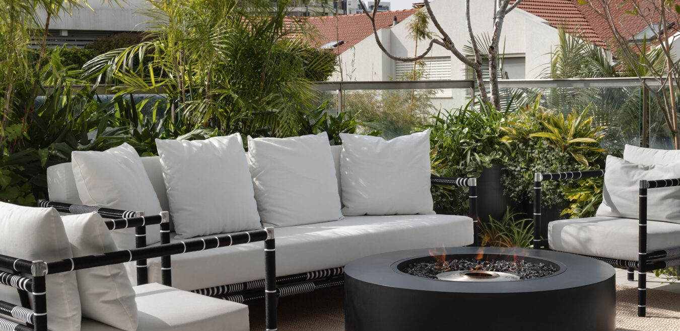 המרפסת תוכננה כהמשך ישיר של הסלון ויצרה חלל אירוח חיצוני רחב ידיים, כמעט כפול בגודלו מהחלל הפנימי. הבחירה בצמחייה טרופית עשירה יצרה מעטפת ירוקה המדמה ריזורט תאילנדי ומעניקה תחושת חופשה ורוגע בלב העיר.