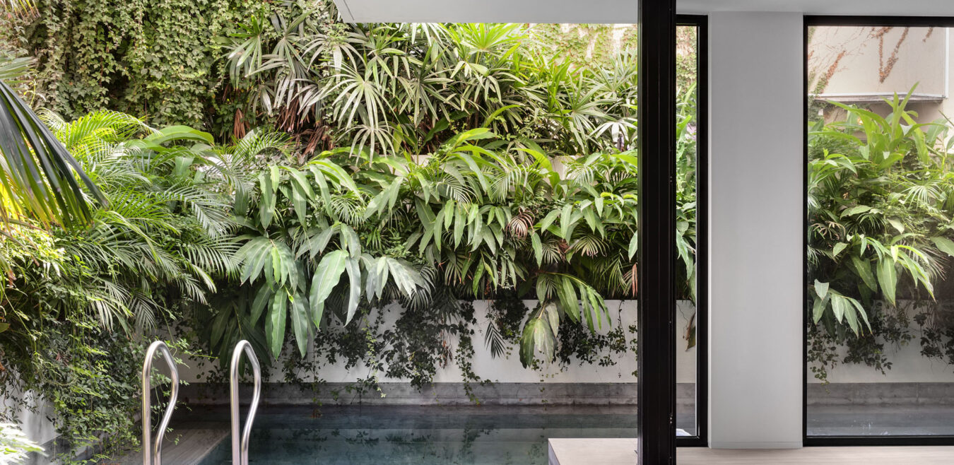 פרטיות סביב הבריכה: כדי לייצר אינטימיות במרחב האורבני, הטמענו פתרונות גינון חכמים המייצרים חיץ ירוק ועשיר מסביב לאזור הרחצה.