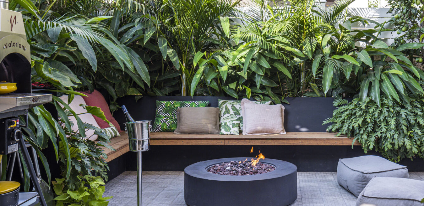לצידו, הוגדר אזור קולינרי ייעודי הכולל טאבון ושולחן אש, המשמש גם כשולחן קפה, והופך את החלק האחורי של הגינה ללב הפועם של הבית.