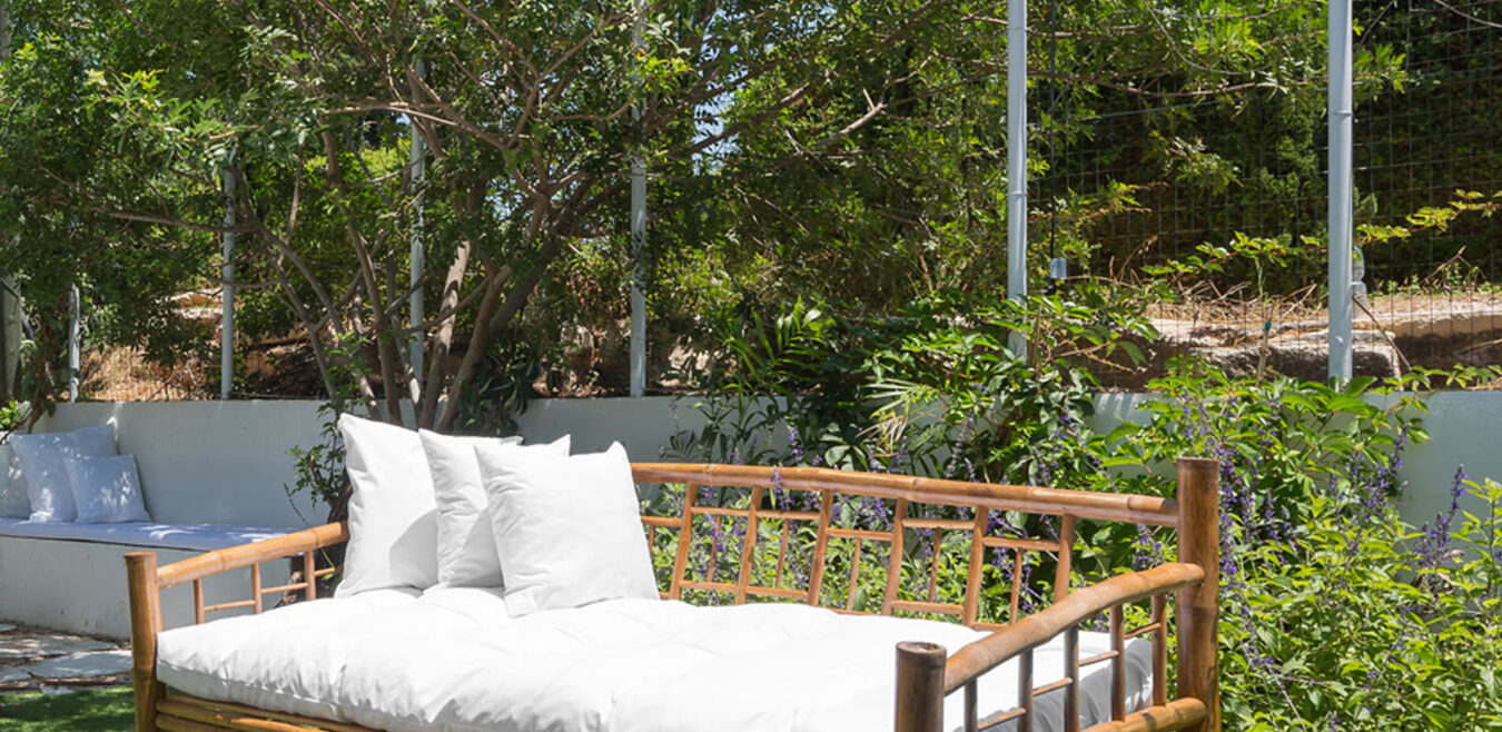 הצללה טבעית: מאחר והגינה פונה לכיוון דרום, השתמשנו בעצים גבוהים במטרה לייצר הצללה ולהשיג תחושה טרופית.